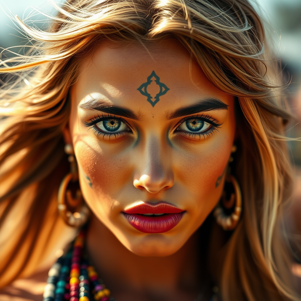 Human, woman, gazing directly at the camera with intense focus, featuring intricate detailing, rendered in HDR, ultra-high definition 8k. Flowing long hair with vibrant highlights. Prominent, expressive eyes and full, luscious lips. Coachella festival vibes intertwined with free-spirited hippie and Burning Man influences. An ethereal blend of bohemian style with colorful beads, unique face paint, and a carefree aura capturing the essence of artistic festivals.