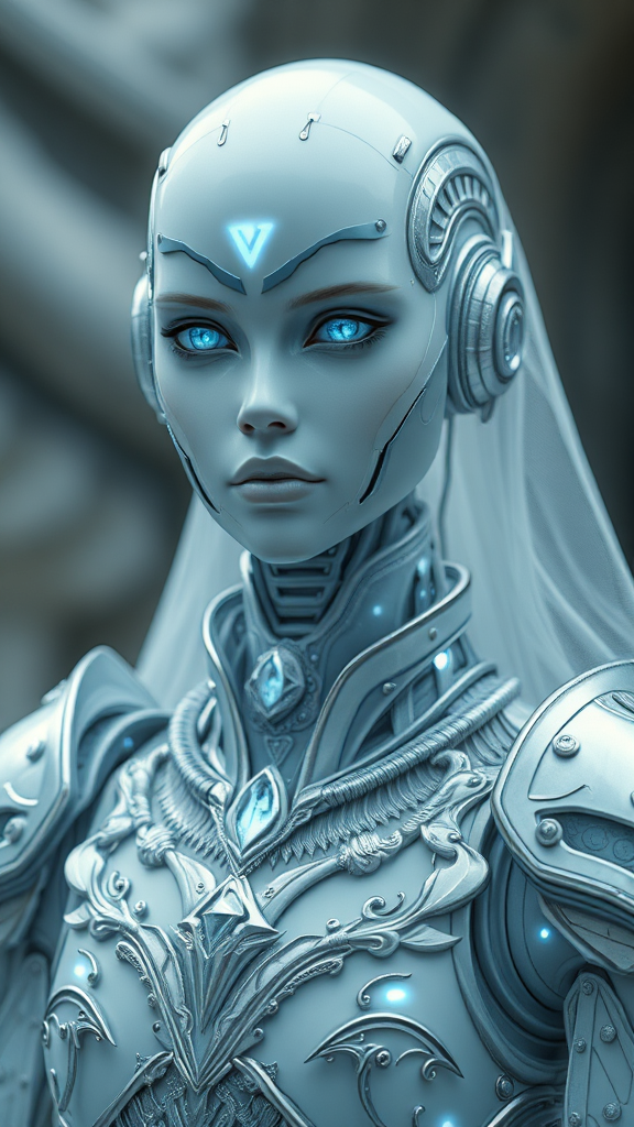Humanoid android with ivory porcelain skin, sapphire blue eyes, and a translucent ghostly aura, donned in intricate silver armor; 4k ultra-realistic fantasy with exceptional detail, ethereal phantom ambiance, hyper-detailed, photorealistic aesthetics, cinematic lighting effects, HDR clarity, high-definition imagery, fine art digital realism; inspired by Mark Molnar's mystical style, rendered with Redshift, showcasing 8k resolution, blending artistry with technology for a mesmerizing visual impact.