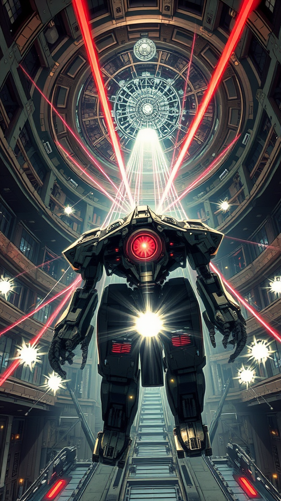 Humanoid mech navigating the interior of a colossal spaceship, inspired by Tsutomu Nihei's aesthetic, reminiscent of Sidonia no Kishi, exploring themes of gigantism and futuristic design. A laser generator pulses at the center of a multi-story space, casting beams that split the darkness with hyper-detail and intensity. Energetic clots of light flash as lasers pierce from the celestial dome above, propelling the mech forward, accelerating with breathtaking speed. The style is distinctively Sci-fi anime, merging the ultra-detailed precision of manga graphics with an 8K Super-Resolution allure. The perspective immerses you in a dynamic first-person viewpoint, capturing every intricate drawing detail in breathtaking high-definition clarity.