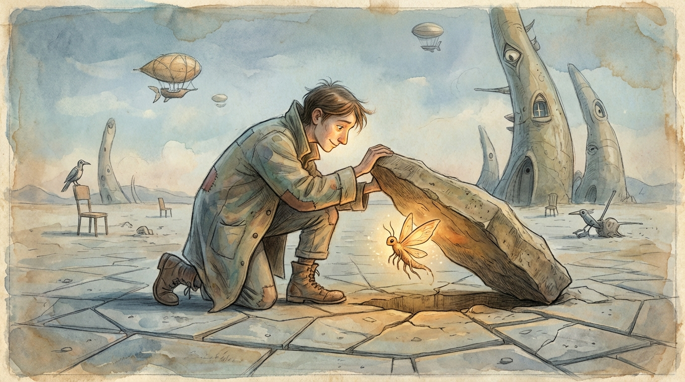 A surreal, painterly illustration in the evocative storybook style of Shaun Tan — soft-edged forms, muted earth tones, delicate textures, and a quiet, symbolic sense of wonder. The scene portrays a solitary hero performing a small yet profoundly meaningful heroic act within a strange, melancholic world. The hero is not grand in a traditional sense, but humble and quietly determined — a slender figure wearing a slightly oversized coat and simple boots, garments textured with soft watercolor washes and fine pencil-like detailing. Their hair is tousled by a gentle wind, their expression thoughtful rather than triumphant. They kneel at the edge of a vast, cracked plain made of enormous stone tiles, carefully lifting a heavy fragment of earth to free a small glowing creature trapped beneath it — a fragile, lantern-like being with softly luminescent skin and delicate, moth-like wings. The hero’s posture shows effort and compassion rather than spectacle: sleeves rolled, hands dusty, shoulders straining as light spills gently from beneath the lifted stone. Their face is illuminated by the creature’s warm glow — amber and pale gold against the subdued blues and greys of the surrounding landscape. The world around them feels vast, quiet, and slightly otherworldly. Strange, towering structures — part building, part organism — lean in the distance, their windows like watchful eyes. Enormous floating seed-like vessels drift slowly through the sky. The horizon fades into soft atmospheric haze. Tiny symbolic details dot the environment: abandoned chairs perched improbably on rooftops, mechanical birds resting silently on wires, faint diagrams etched into stone. The color palette is subdued and emotional — dusty ochres, muted blues, soft sepia, pale sage greens, and warm interior glows of amber light. The lighting is diffused and dreamlike, as if filtered through memory. Shadows are soft, edges imperfect, textures layered like aged paper and thin washes of gouache. The composition emphasizes scale and tenderness: the hero small within the immense world, yet central because of their act. The true heroism lies in compassion — in lifting, protecting, restoring something delicate in a world that feels worn and forgotten. Textures are tactile and organic: cracked plaster, weathered stone, soft fabric fibers, faint pencil marks, translucent glowing wings. The overall tone is contemplative rather than explosive — heroic not through spectacle, but through quiet courage and empathy. A Shaun Tan–inspired illustration of understated heroism — surreal, symbolic, intimate, and filled with quiet emotional resonance.