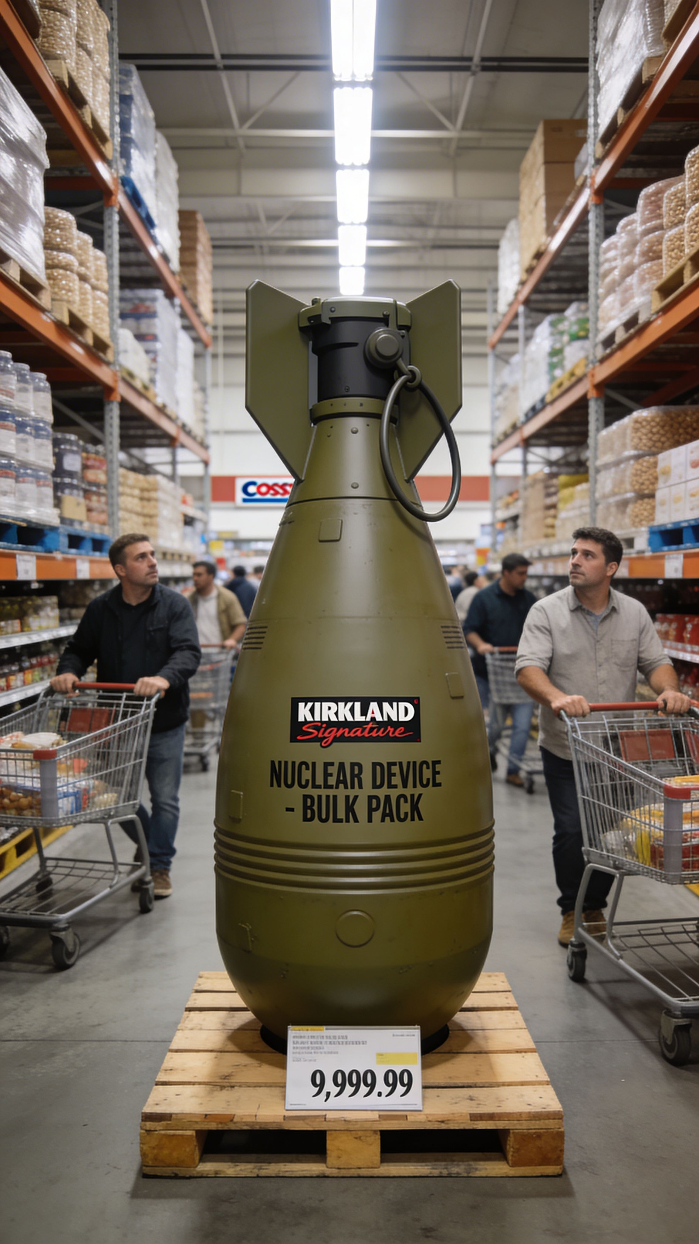 Photorealistic image of a large, olive green, cartoonish nuclear bomb labeled "KIRKLAND Signature" and "NUCLEAR DEVICE - BULK PACK" with a price of "9,999.99" on a wooden pallet in the center of a bustling Costco warehouse. Several male shoppers with carts filled with groceries are visible, some looking at the bomb. The warehouse features towering shelves stocked with bulk items, under bright fluorescent lighting. The mood is surreal and humorous, with natural, cool-toned colors dominated by the greens of the bomb and the browns and grays of the warehouse. Sharp focus on the bomb, slightly softer on the background elements.