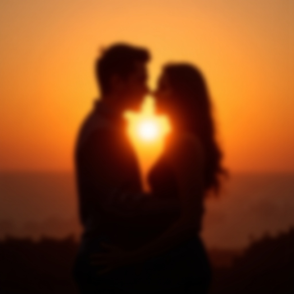 In the tender hush of twilight, two lovers are entwined in each other’s arms, their forms a graceful dance of shadow and warmth. The soft, golden hue of the setting sun casts a heart-shaped halo around them, painting their silhouettes with a loving glow that speaks of an unspoken, timeless connection.