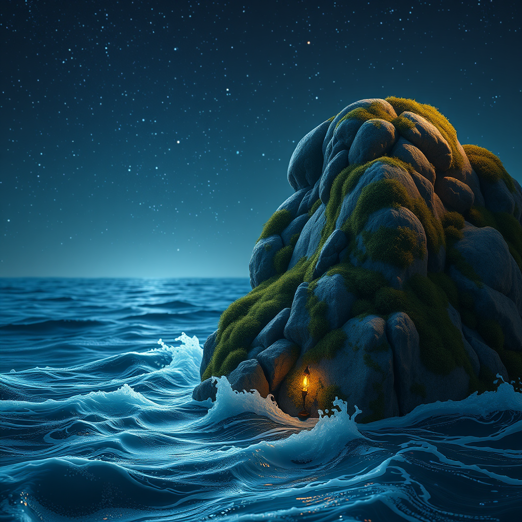 Hyper-detailed 3D render in 8k resolution featuring an intricately detailed ocean under a star-studded night sky, with a beautifully textured, moss-covered low-poly rock illuminated by cozy, cinematic indoor lighting. The scene is inspired by character designs from artists like Mark Ryden, Pixar, and Hayao Miyazaki, showcasing a close-up view with cinematic lighting and extensive fine details. The dreamcore aesthetic is trending on ArtStation, rendered in 4k with hyper-realistic focus and extreme detail. Created in Unreal Engine 5 with ultra-detail quality and an ultra-realistic appearance, the scene features overcast reflection mapping, movie-quality VFX post-production, dramatic shadows, and RTX ray tracing lighting. Enhanced with 8k post-processing, the hyperrealistic depiction is achieved in Redshift style and Octane Render.
