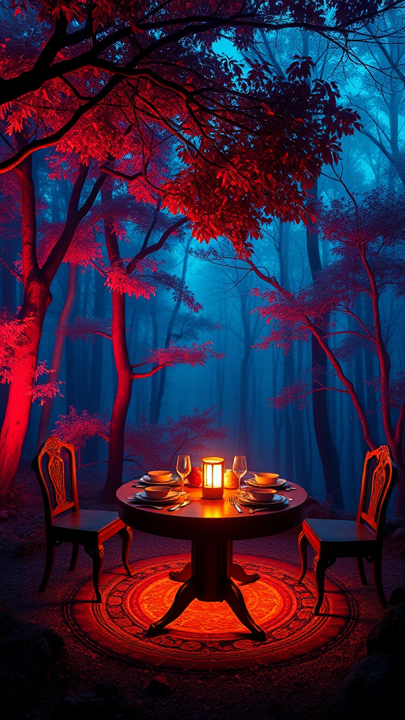 Hyper-detailed atmospheric oliva lighting illuminating a table set against a vibrant-colored forest backdrop, captured in sharp 4k UHD resolution with dark vibes, epic composition, and high resolution. Rendered in octane with a focus on an isometric Asian-Chinese aesthetic, blending elements of surreal and dreamlike qualities in a visually striking, dream-evoking scene.