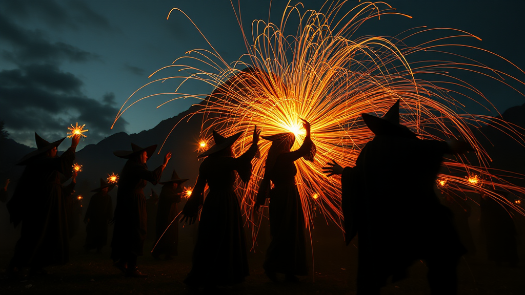 Hyper detailed depiction of a powerful spell being cast by a large coven of witches, with the mystical Blocksberg mountain silhouetted in the background, captured in motion. Shot on a state-of-the-art Hasselblad H4D 200MS digital camera using a Mitakon Speedmaster 300mm f/5.6 XCD lens. The scene is imbued with a dark aesthetic, accentuated by glowing ember light and the ethereal glow of light pollution. The witches' intricate movements create an epic light display that dances through the air, echoing ancient rituals.