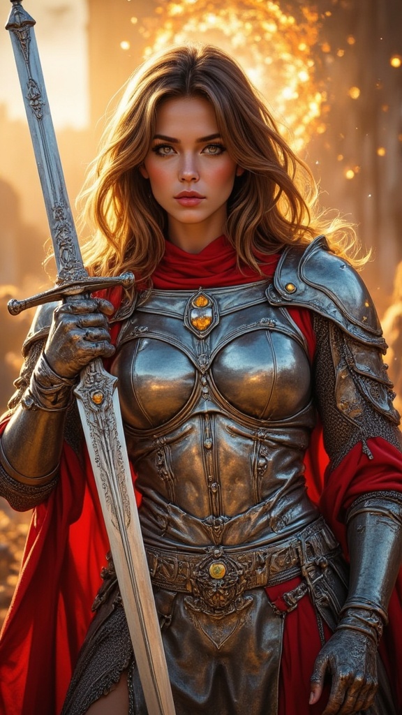 Hyper-detailed digital art of a majestic female paladin, modern superhero aesthetic, statuesque Caucasian woman standing 6'2", athletic build with defined muscles, photorealistic face, dark brown shoulder-length hair with volumetric coily curls and side part, striking bluish-grey eyes with subtle ethereal glow, determined yet compassionate expression. Ornate silver solar amulet with brilliant golden topaz cabochon, floating and pulsing with divine energy. Form-fitting scarlet red silk shirt with metallic sheen, asymmetrical fantasy armor featuring intricate silver pauldron and breastplate on right side, baroque solar motifs and Art Nouveau scrollwork, polished to mirror finish. Elaborate silver bracers and articulated gauntlets with celestial engravings. Wide ceremonial silver belt with massive sun-symbol buckle housing golden topaz crystal. Flowing chainmail battle-skirt with individual links catching light, reaching mid-thigh. Sleek silver greaves and knee-high armored boots with solar accents. Dramatic scarlet cape with liquid silk movement, secured by ornate silver solar clasp. Massive silver greatsword with ethereal glow, blade etched with ancient solar runes, crystalline golden topaz in pommel. Dynamic battle stance, sword raised against encroaching darkness, radiating golden divine light with cinematic god rays, brilliant solar halo crown floating above. Volumetric lighting, dramatic rim lighting, golden hour atmosphere, ray-traced reflections on armor, high contrast, ultra-detailed, epic fantasy composition, octane render, 8k resolution, photorealistic materials.
