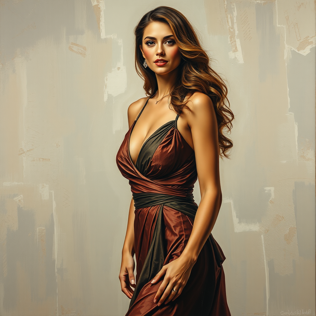 Hyper detailed full-body portrait of a confident woman in an alluring dress, exuding charm::5 Realistic landscape painting::4 expressive brushstrokes, textured, intricately detailed, precise depiction of nature, earthy tones, traditional oil painting technique, premium canvas, exclusive edition, acclaimed for excellence, glibatree inspired style::3 signature, mundane, uninspiring, abstract::-2
