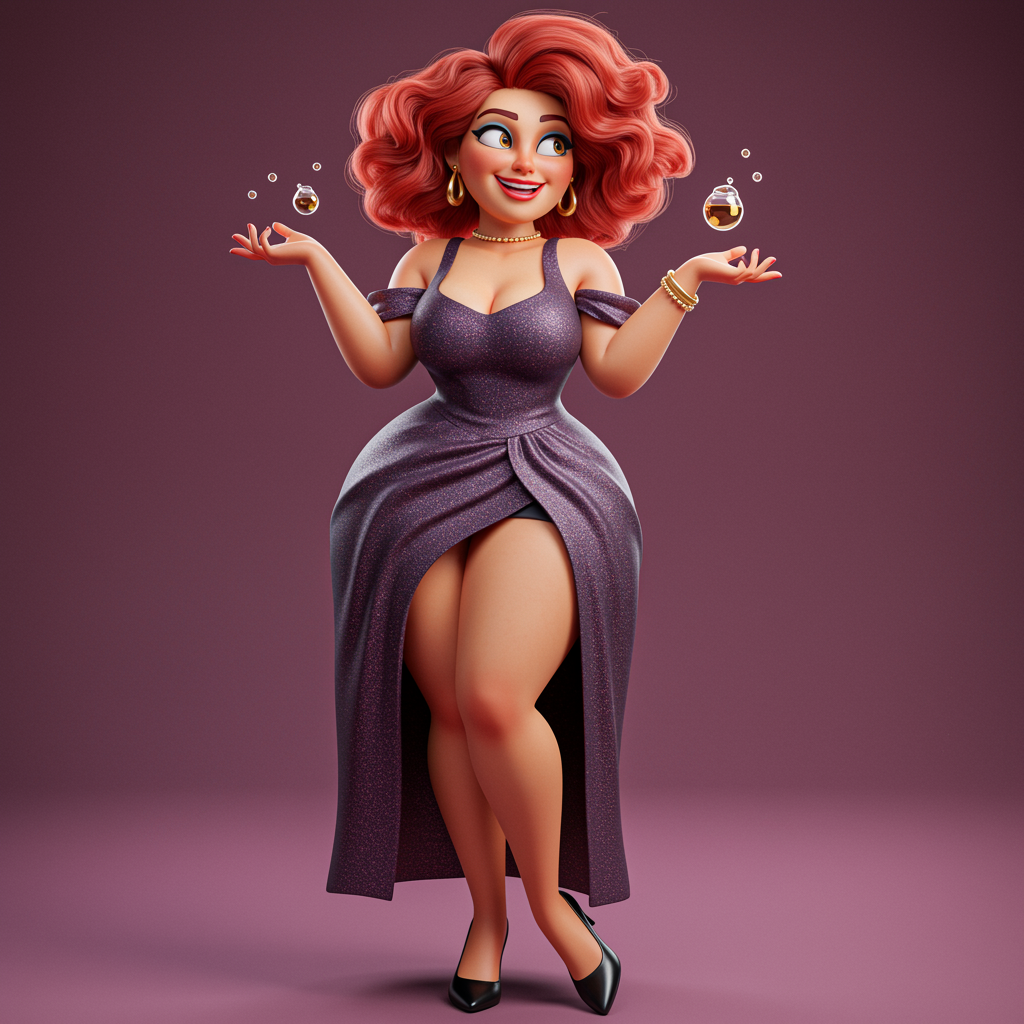 Hyper detailed full body portrait of a vibrant woman in a daringly elegant dress, exuding charisma and confidence as she engages playfully. Whimsical character design, creative, expressive, highly detailed, colorful, with stylized anatomy. High-quality digital art, 3D rendering, stylized and unique, worthy of accolades, crafted using Adobe Photoshop, 3D Studio Max, and V-Ray. Playfully fantastical elements, with a minimalist plain background to emphasize her presence.