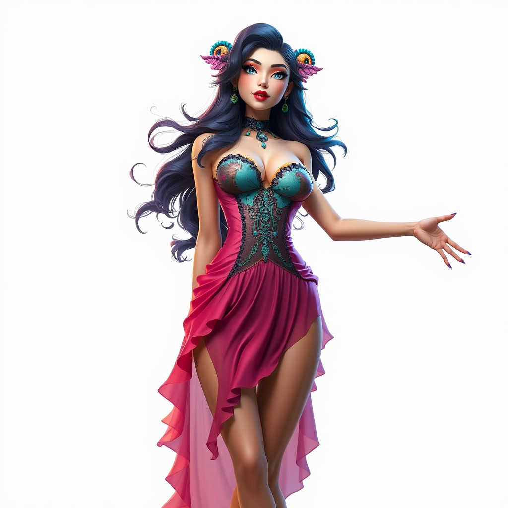 Hyper detailed full body portrait of an alluring woman in a captivatingly provocative dress, exuding a vibrant and flirtatious energy. Whimsical character design featuring creative, expressive, and intricate details. The depiction is colorful and showcases stylized anatomy. Rendered in high-quality digital art, using Adobe Photoshop, 3D Studio Max, and V-Ray for a unique, award-winning finish. The character is playful and fantastical, set against a plain, simple background to emphasize her dynamic presence.