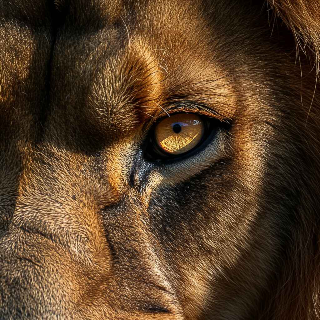 Hyper-detailed macro photography capturing the intense gaze of a lion's eye, showcasing its fierce ferocity and expressive power. The enraged look is brought to life with photo-realistic precision and cinematic lighting, emphasizing hyperrealism. The 4D dimension adds depth, highlighting ultra-realistic textures and details. The scene is illuminated with expert photography lighting, ensuring the highest quality detail and vivid realism throughout.