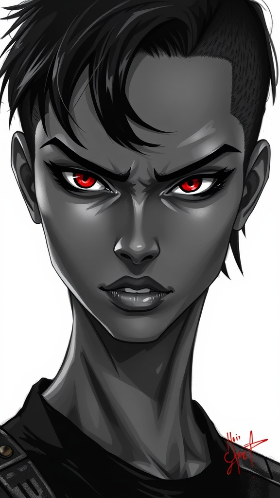 Hyper-detailed portrait of a character with a fierce expression, inspired by Levi Ackerman from Attack on Titan. The character has short hair, a clean shave, and deep, detailed skin with an intense focus. Designed as a digital painting, it combines elements of both a black woman and a Chinese woman, presenting them in a monochrome, black-and-white scheme. The character has captivating red eyes and a blend of brown and natural African hair texture. Features are exaggerated for artistic impact, including a gracefully elongated neck, while keeping the portrait well-composed and avoiding unrealistic elements like mutation or floating limbs. The goal is a boldly expressive and meticulously crafted piece that conveys intensity and strength.