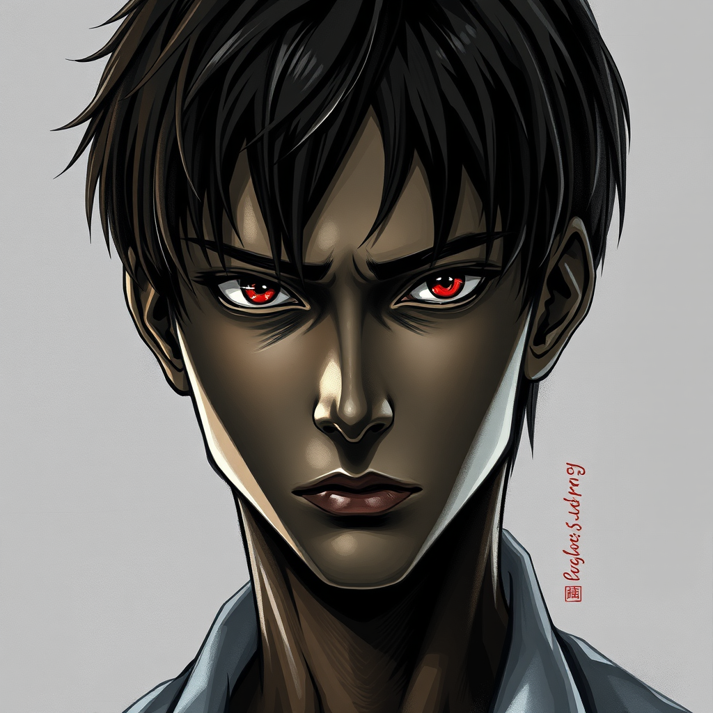 Hyper-detailed portrait of Levi Ackerman from Attack on Titan, featuring an intense expression with short hair and a clean-shaven face. The digital painting highlights deep skin tones and intricate details. The artwork blends influences from both a black woman and a Chinese woman, presented in a monochrome, black-and-white style. The character's eyes are rendered in a striking red, with brown and African-influenced hairstyles. The composition elongates the neck and incorporates elements of plasticity. Despite creative liberties, the portrait maintains integrity with natural anatomy and well-drawn features while exploring abstract and surreal motifs.