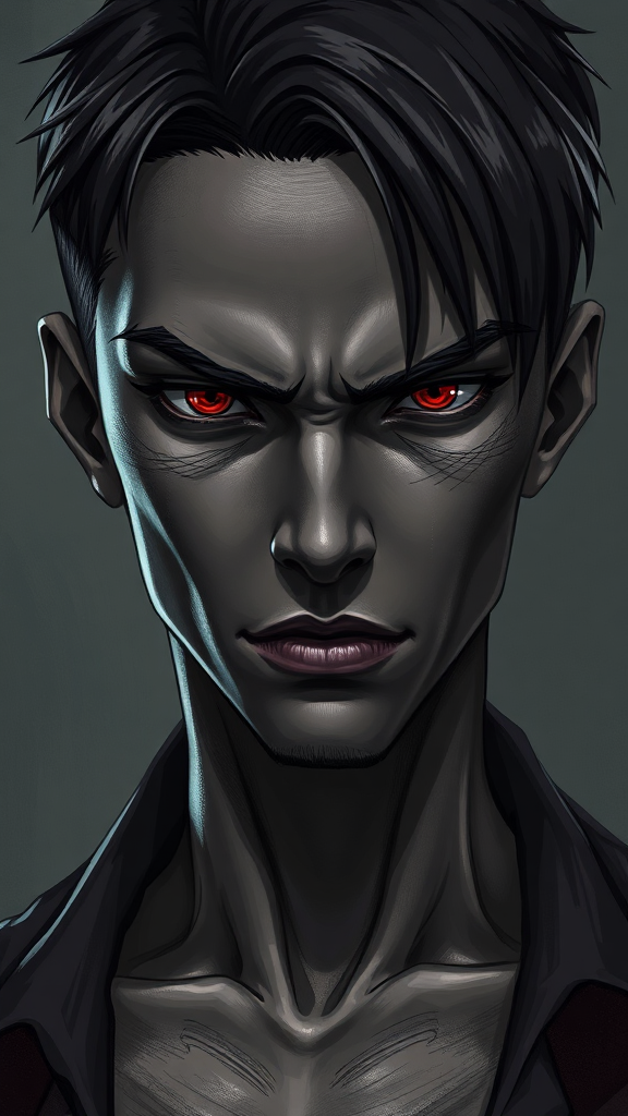 Hyper-detailed portrait of Levi Ackerman from Attack on Titan, featuring an angry expression, short hair, and clean-shaven, with rich, textured skin and profound detail in a digital painting style. Inspiration from a black woman and a Chinese woman, emphasizing a monochrome palette in black and white. The concept is maintained with a focus on realistic details—such as red eyes and a blend of brown and African hair—and an elongated neck. The character is presented with precise anatomy, expressive eyes, and well-defined facial features, avoiding any unrealistic or distorted elements. The image captures an intense gaze and determined expression, grounded in reality and poised with strength.