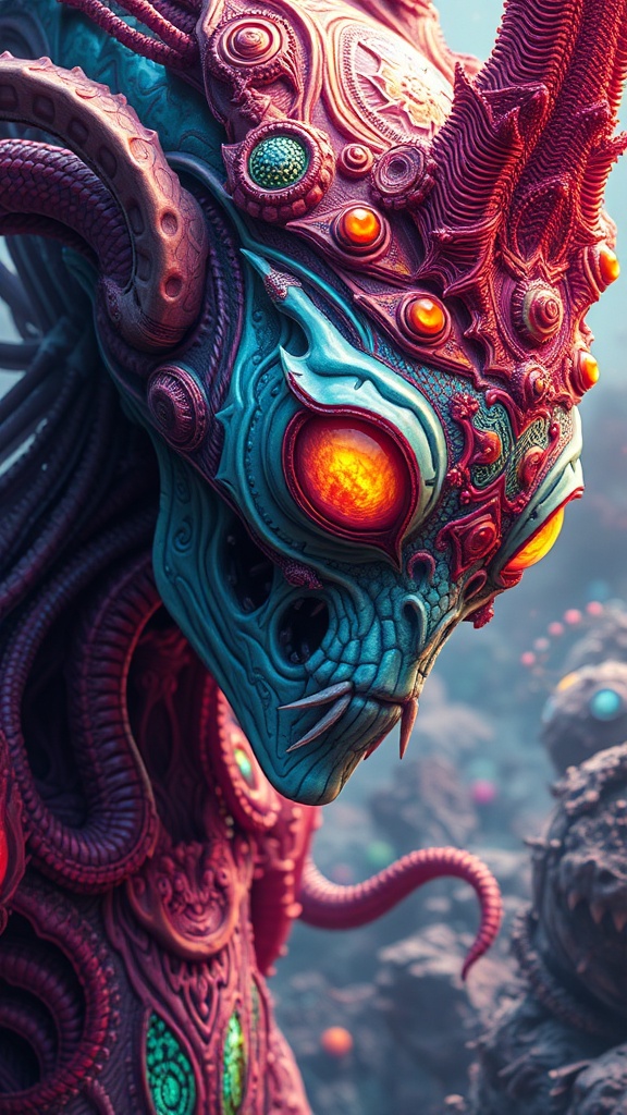 Hyper detailed and ultra sharp, bursting with life on ArtStation, an explosion of vibrant aesthetics, bloodwave energy, and a kaleidoscope of color. Envision a psychedelic, ornate, and intricately crafted digital painting that merges concept art with smooth, razor-sharp focus. The illustration captures an anthropomorphic alien, a fusion of otherworldly forms, reminiscent of the styles of Artgerm, Greg Rutkowski, and H.R. Giger. The scene is rendered in stunning 8k resolution, presenting a mesmerizing blend of the surreal and the hyper-real, inviting viewers into an awe-inspiring universe.