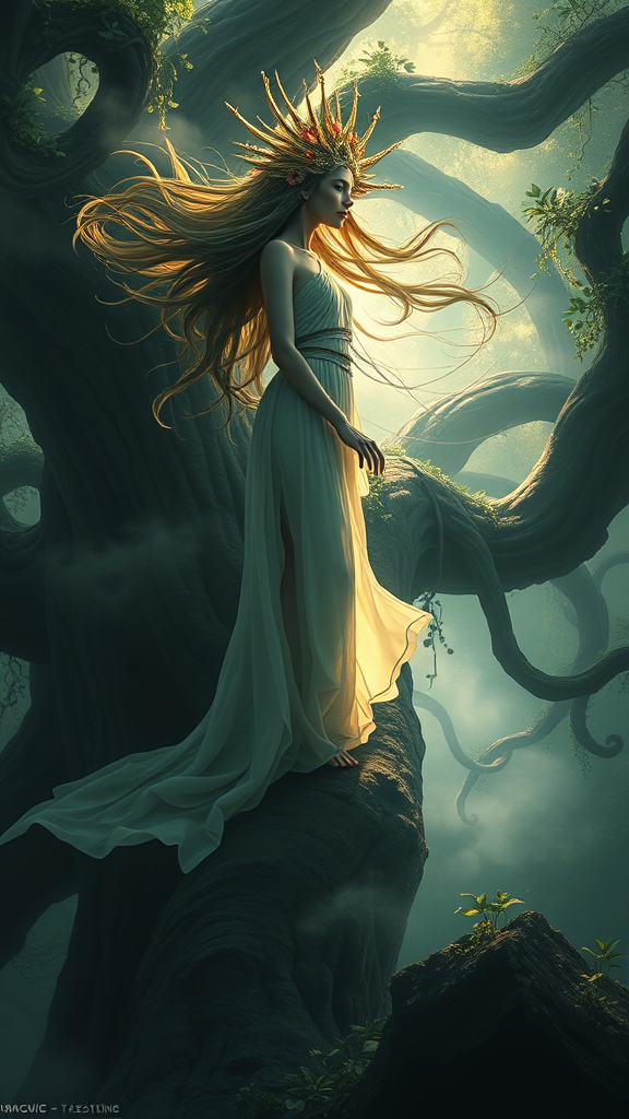 Hyper-maximalist intricate cinematic portrayal of a floral forest deity with flowing long hair and minimal attire, inspired by Magic the Gathering. Surrounded by swirling clouds of leaves and wind, she stands amidst a maze of vines on an enormous ancient tree, exuding an aura of mystery and allure. Her elegant pose is captured with intense lighting and deep shadows, drawing from orthodox symbolism. This concept art is rendered in the style of ArtStation and Unreal Engine, featuring magic realism with ambient occlusion and volumetric lighting. The scene is portrayed in 8k resolution, combining tribal dark fantasy elements with subtle modifications for an emotional and evocative portrayal, maintaining an aspect ratio of 3:2.