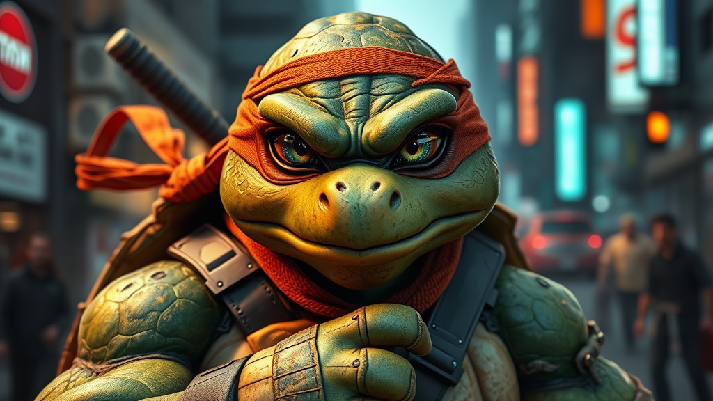 Hyper-realistic 8K 3D depiction of a Ninja Turtle, showcasing incredible micro-details and intricate textures, with lifelike skin, weathered battle gear, and expressive eyes, set in a dynamic urban scene with stunning lighting and environmental effects, capturing the essence of stealth and agility with creative, imaginative elements woven into the core concept.