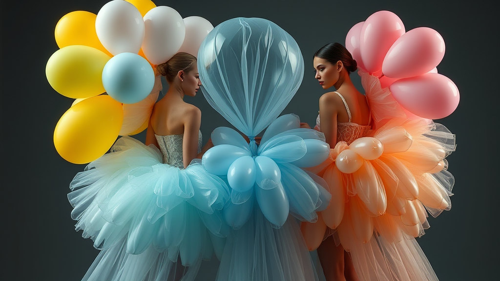 Hyper-realistic 8k still images of enigmatic fashion models enveloped in gossamer puff dresses crafted from hand-tied and uniquely colored balloons, rendered in striking 3:4 aspect ratio, evoking an air of ethereal wonder and gently drifting movement.