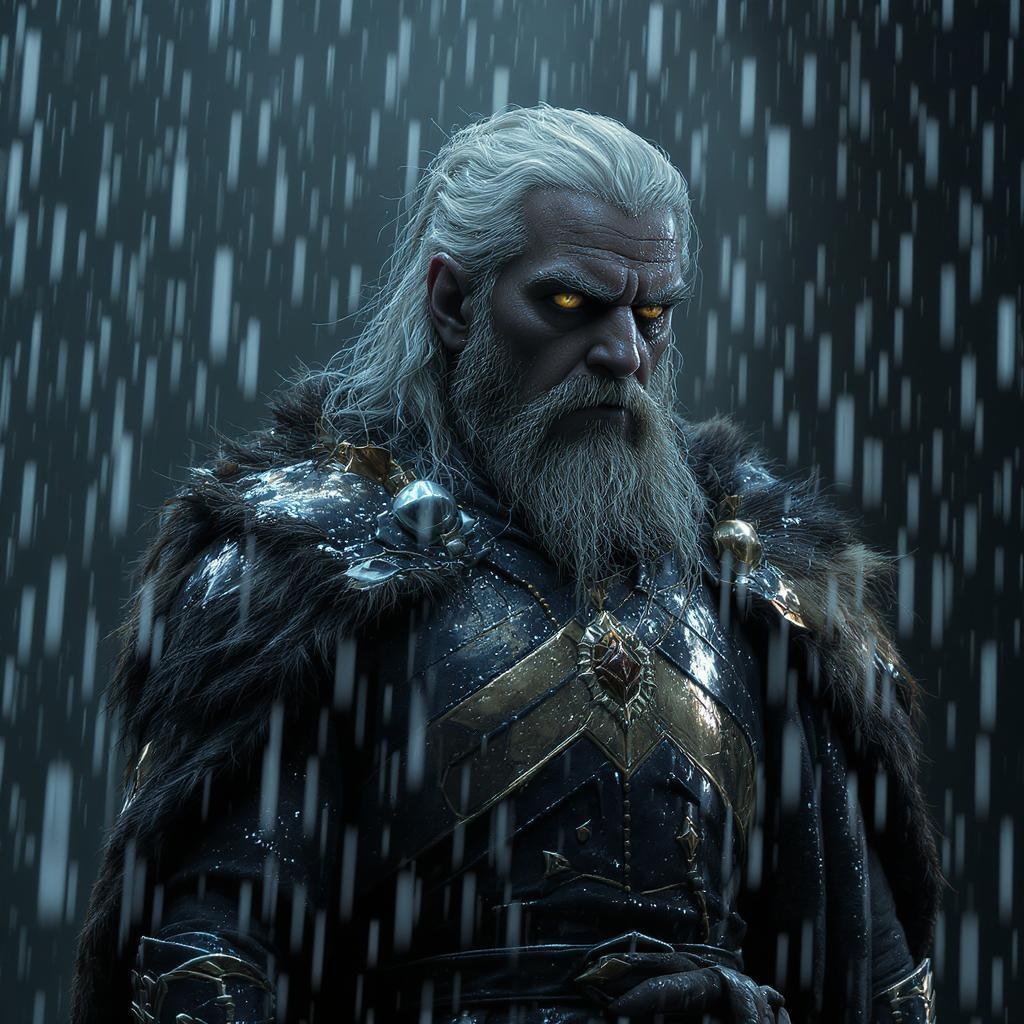 Hyper-realistic anthropomorphic Targaryen in shimmering robes with intricate details, drenched in a dramatic rainstorm, capturing intense emotion, epic cinematic lighting, ultra-HD resolution, portrayed as if shot on a Hasselblad H6D-400c Multi-shot, elongated composition 1:2, with a touch of surreal creativity and chaos, maintaining the essence of grand storytelling and vivid immersion.