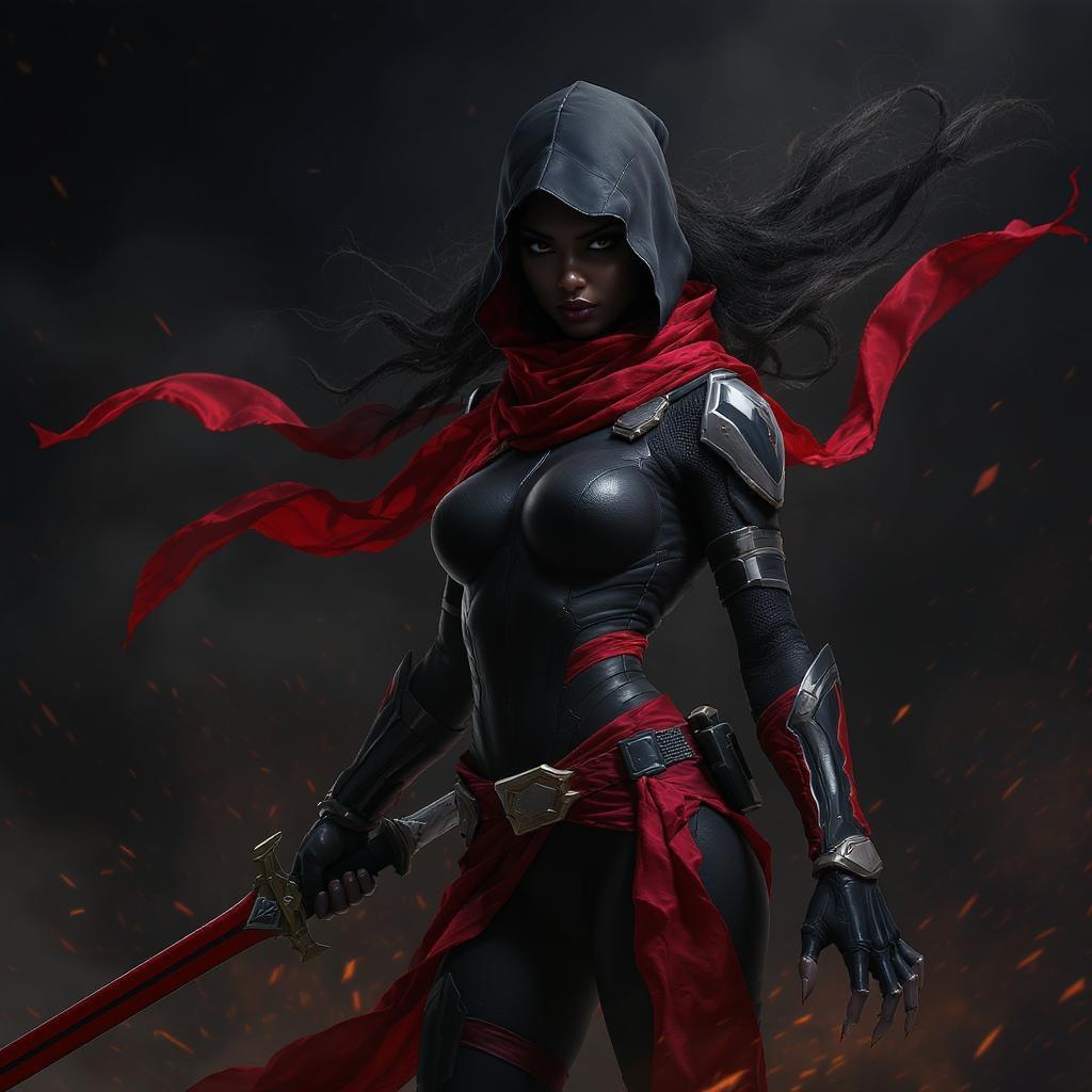 Hyper realistic assassin wielding ninja weapons, donned in a sleek, form-fitting black battlesuit accentuated by a vibrant red scarf elegantly draped around her neck. Her youthful appearance, around 20 years old, adds a striking contrast to the intensely detailed and futuristic setting. The rendering is in 8k upscaled, ensuring each element stands out in high-definition quality. Her hands, a focal point of intrigue, are adorned with multiple fingers, numbering six, reflecting an artistic interpretation of imperfection with their deformed appearance. An Asian-African woman, she possesses a unique blend of black, curly hair and features that celebrate a multicultural identity. Her elongated physique, with an exceptionally long neck and hands, creates an ethereal presence. Her form appears dynamically split and doubled, suggesting an otherworldly, mixed nature that defies conventional boundaries.
