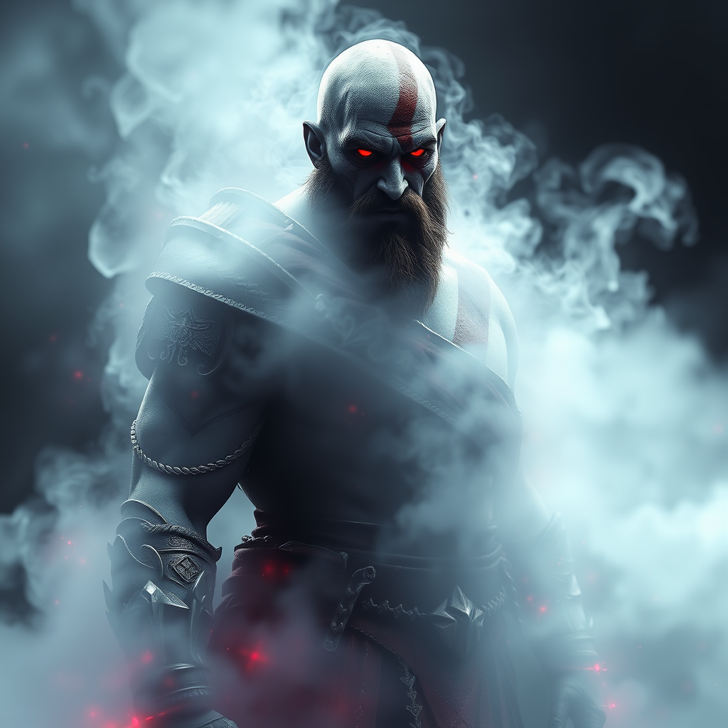 Hyper realistic character design of a God of War inspired Kratos as a void arcanist, enveloped in ethereal mist, photorealistic quality, rendered with octane and unreal engine 5, ultra high definition 8k, extraordinarily detailed with striking volumetric lighting, HDR effects, cinematic aspect ratio of 9:16, infused with subtle mystical elements, showcasing intricate textures and atmospheric depth.