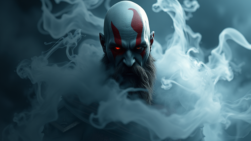 Hyper-realistic character design of Kratos as a void arcanist, enveloped in swirling mist, rendered in photorealistic detail using Octane and Unreal Engine 5. Capturing an 8k resolution image with hyper-detailed features, enhanced by dramatic volumetric lighting and HDR effects. Set in a dark, mystical environment that emphasizes his powerful presence, maintaining the iconic elements of Kratos while infusing them with arcane and ethereal aesthetics. Aspect ratio 9:16.