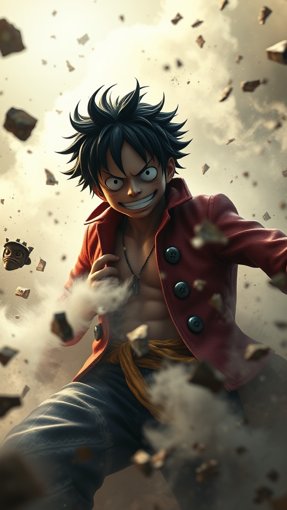 Hyper realistic character design of Luffy from One Piece, surrounded by swirling mist, utilizing photorealistic detail with Octane Render and Unreal Engine 5, in ultra high-definition 8k resolution, hyper detailed with intricate textures, enhanced by volumetric lighting and HDR effects. The scene captures a dynamic and intense moment of raging combat set against a backdrop of chaos and conflict, with swirling debris and dramatic lighting casting dramatic shadows and highlights.