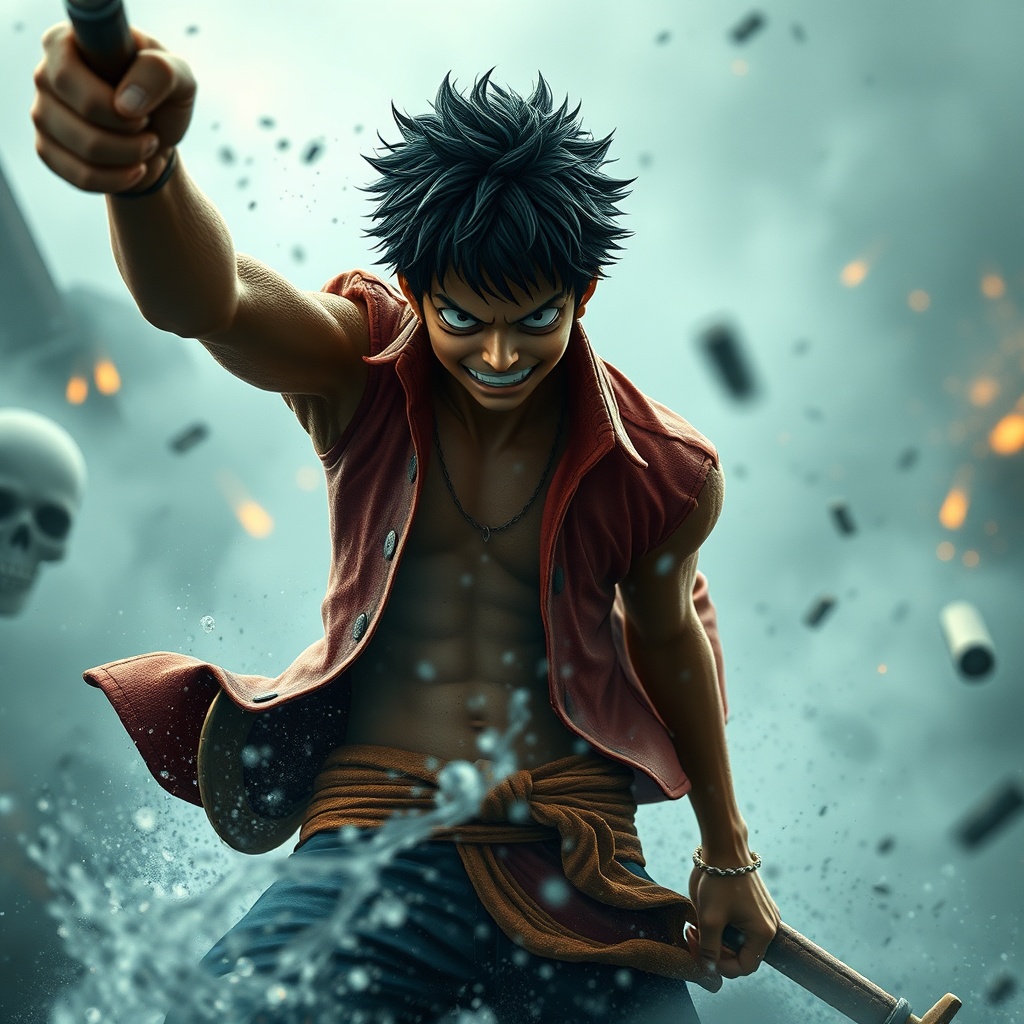 Hyper realistic depiction of One Piece character Luffy in the midst of a swirling mist, photorealistic detail with the power of octane render and Unreal Engine 5 technology, captured in stunning 8k resolution. The scene is hyper detailed with volumetric lighting that accentuates every feature, enhanced by HDR effects. Luffy is caught in a dynamic action pose amidst a raging combat, the background alive with chaos and conflict. Small creative modifications present a more rugged texture to his clothing, reflecting the intensity of battle, while his expression is both fierce and determined, capturing the spirit of a true pirate in the heart of the storm.