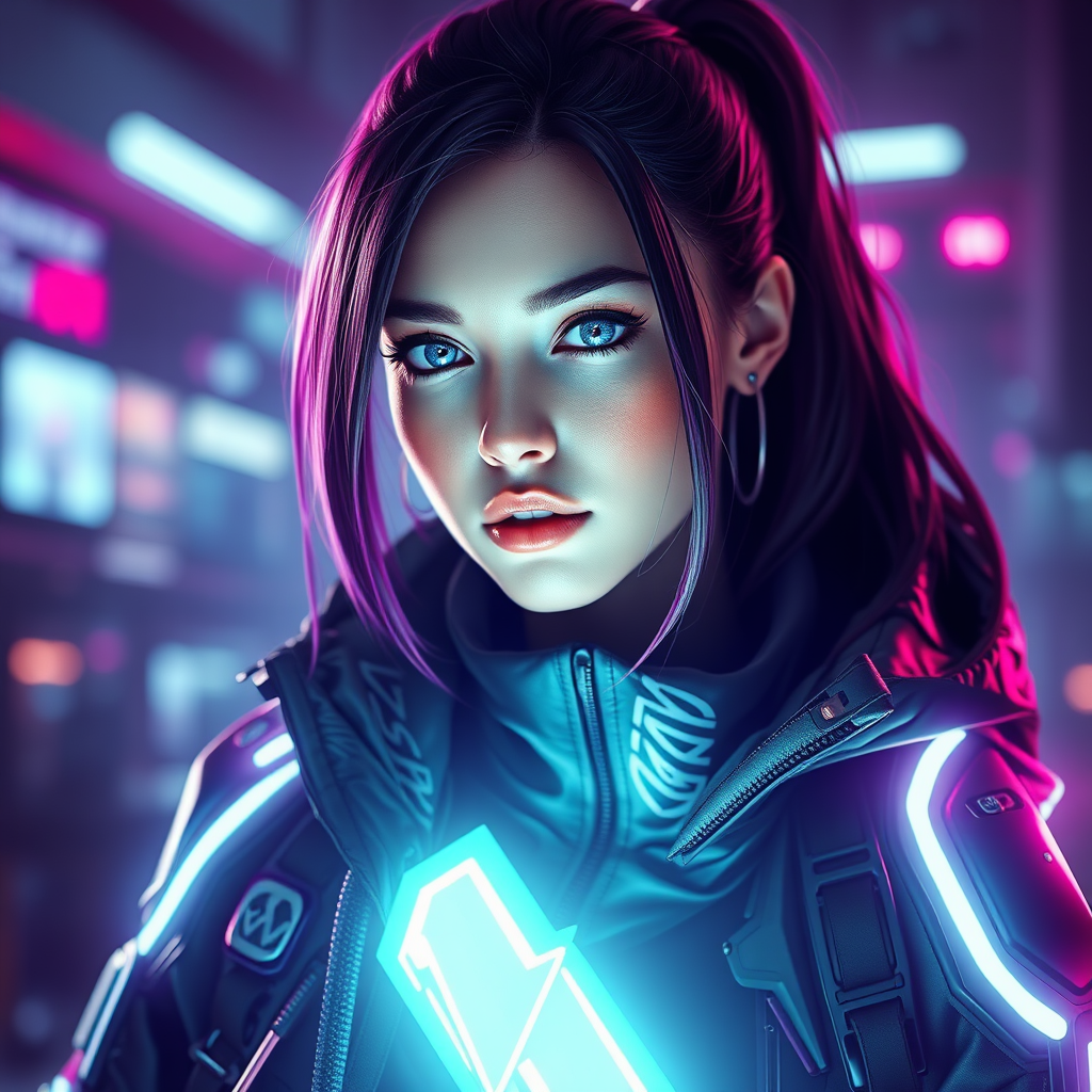 Hyper-realistic cyberpunk female with an advanced techwear jacket and high-tech acronym design, captured from an epic perspective. She possesses radiant, perfectly clear blue eyes and a flawlessly sculpted face. The scene is rendered in stunning 8k resolution, with vibrant, bright illumination. Enveloped in volumetric light, the magical neon glow of her aura creates an ethereal atmosphere around her.