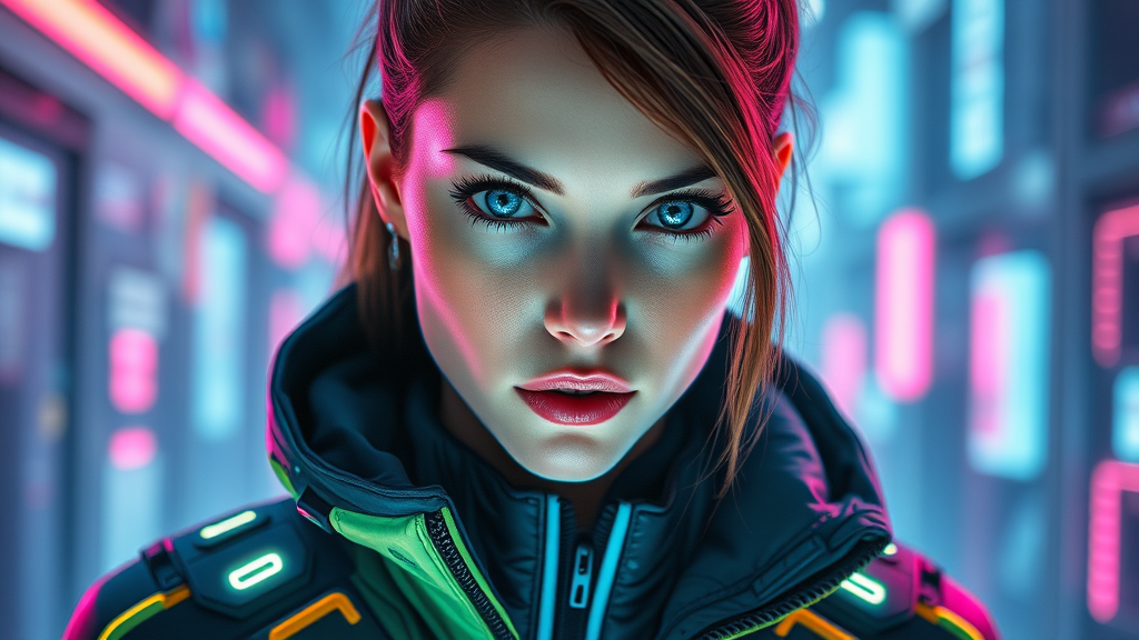 Hyper-realistic cyberpunk woman, donning a high-tech jacket with intricate designs, accented by a futuristic techwear style. Her features are incredibly striking, framed with an epic perspective that showcases her radiant, perfectly clear blue eyes and flawless face. The setting is illuminated in 8k resolution with vivid, bright colors, enhanced by volumetric lighting that glows with an ethereal, magic neon aura. This scene is a fusion of advanced technology and mysticism, creating a captivating visual narrative.