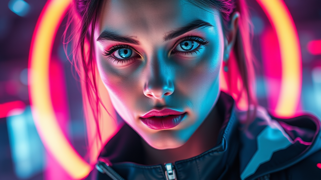 Hyper-realistic cyberpunk woman wearing a cutting-edge techwear jacket, similar to an acronym jacket, captured from an epic perspective. Her face is flawless, exuding an ethereal beauty, with perfectly clear bright blue eyes that seem to glow. The scene is illuminated by volumetric lighting, casting vibrant neon hues that surround her like an electric aura, enhancing her presence. Her radiant features set against a futuristic backdrop evoke a sense of magic within the high-definition 8k resolution, creating an immersive display of cybernetic elegance.