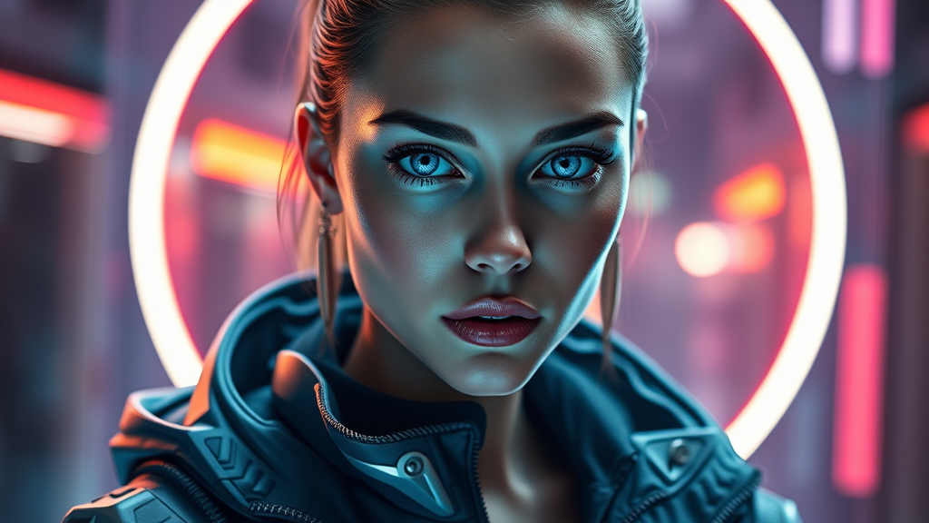 Hyper realistic cyberpunk woman wearing a sleek techwear jacket, adorned with intricate details reminiscent of an Acronym jacket, captured from an epic perspective. Her radiant, perfectly clear blue eyes shine with an otherworldly glow, framed by a flawless face. The scene is rendered in stunning 8k resolution, with a radiant brightness and volumetric light enhancing her presence. A magical neon aura envelops her, casting an ethereal glow that highlights the futuristic and enchanting atmosphere.