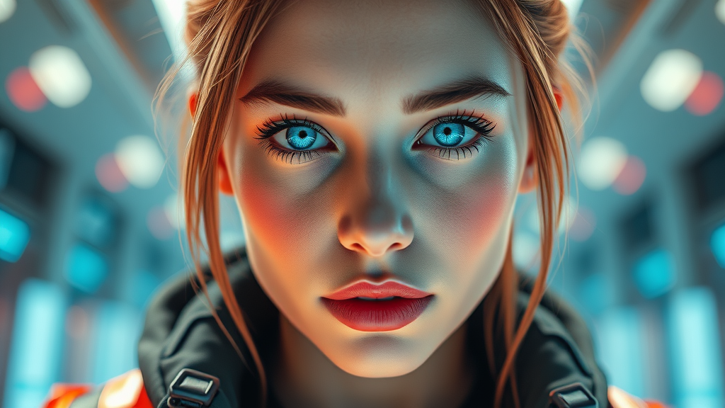 Hyper-realistic cyberpunk woman with a techwear and acronym jacket, captured from an epic perspective. Her perfectly clear, radiant face is framed by striking blue eyes that shine with magic neon vibes. The scene is illuminated by volumetric light, highlighting her futuristic aura in 8k detail and surrounded by a radiant, bright ambiance.