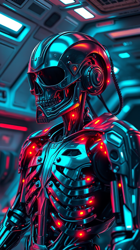 Hyper-realistic cyborg aboard a futuristic starship, showcasing anthropomorphic cybernetic skeleton elements integrated into sleek metallic armor adorned with vibrant neon light reflections. The scene is enhanced by complex reflection mapping and an intricately detailed design, enveloped in dramatic lighting. The visual captures a cinematic feel, offering photorealism in exquisite 8k resolution. The ratio accentuates the majestic vertical presence of the cyborg, adding theatrical intensity to the setting.