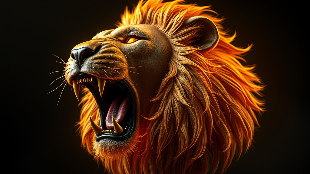 Hyper-realistic depiction, 3D render of a lion's head in mid-roar, shimmering with molten gold cascading from its mane, expertly rendered with Unreal Engine and Octane for exceptional detail and depth, enhanced by dramatic studio lighting, showcasing intricate textures and vivid realism in 8k resolution, set against a rich, dark backdrop.