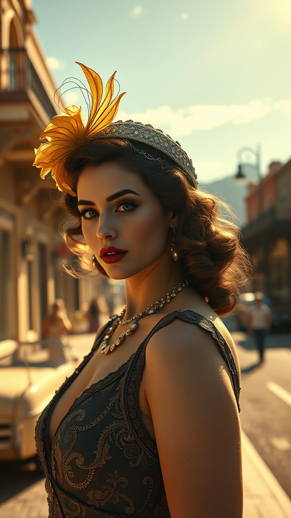 Hyper realistic depiction of a ravishing femme fatale, transported to a sun-kissed city street, circa 1920s, in the midst of Arizona's desert landscape, paying homage to the elegance of JC Leyendecker's style, infused with the sinuous curves and luxurious ornamentation of Art Nouveau, rendered in photorealistic 3D detail, utilizing the atmospheric capabilities of Octane Render, with a cinematic aspect ratio of 9:16, bathed in warm, golden uplight, emphasizing the tender curves of her face and the sophistication of her attire.