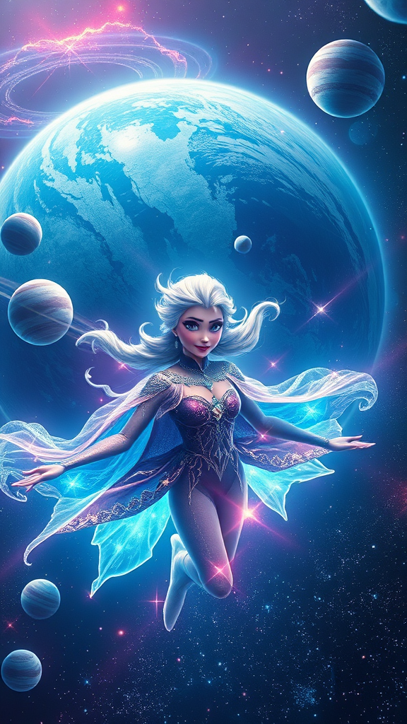 Hyper realistic depiction of Elsa as a powerful deity soaring through the cosmos, with vibrant planets orbiting her; she glides gracefully before an enormous, enchanting ice planet. Her features are striking and divine, adorned in elaborate, celestial-themed garments. The scene is infused with the cool hues of the cosmos, interwoven with neon luminescence that glows brilliantly in the cosmic darkness, showcasing intricate details and ethereal beauty.