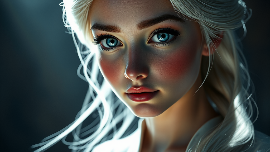 Hyper-realistic depiction of Elsa from Frozen, showcasing intricate details with sharp focus and highest quality, hard foreboding light creating dramatic shadows, dynamic angle capturing her perfect form in a full-body shot. The scene highlights highly detailed skin texture and a beautifully rendered face with striking eyes. Muted tones enhance the composition, giving it a professional photography feel, achieving a sense of realistic hyperrealism, akin to 16k, UHD, HDR imagery.