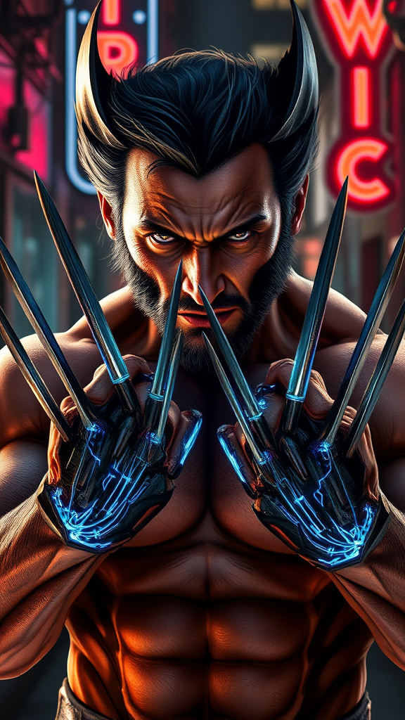 Hyper-realistic digital portrait of Logan, famously known as Wolverine, rendered in the signature style that combines photo-realism with whimsical textures. Wolverine's rugged face and powerful physique are depicted with meticulous detail, with minor scars and bruises enhancing the gritty realism. His adamantium claws are extended menacingly, reflecting the harsh light from neon signs in a shadowy alleyway. Subtle glowing patterns weave through his muscles and beneath his skin like intricate circuitry, illuminating the raw power within. Slight creative flourishes include an infusion of bioluminescent elements accentuating his battle-ready posture.