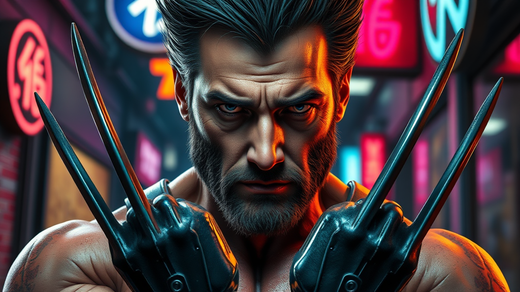 Hyper-realistic digital portrait of Logan, known as Wolverine, rendered in a unique style that balances photo-realism with imaginative, textured elements. His rugged face and muscular build are depicted with meticulous detail, featuring minor scars and bruises that add to the authenticity. Wolverine's adamantium claws are fully extended, gleaming sharply under the vibrant glow of neon symbols in a dimly lit alley. Soft, luminescent threads flow through his muscles and weave between his armor's plating, reminiscent of glowing circuitry. Adjustments include a subtle interplay of shadow and light on his face, adding depth and intensity to his expression, and a touch of vibrant color reflected in his eyes, hinting at his indomitable spirit.