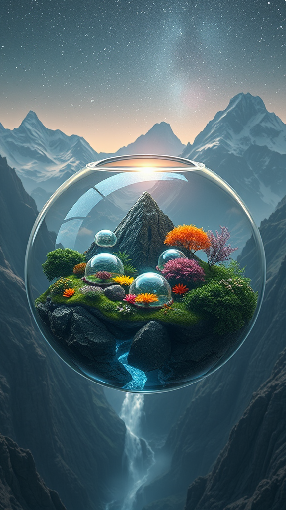 Hyper-realistic, epic depiction of a nested world within a world, encapsulated within a crystal-clear glass bowl, rendered with Unreal Engine 5.2 in stunning 8k quality; detailed layers reveal a lush, vibrant ecosystem thriving under iridescent, shimmering domes; the outer world embraces a sprawling landscape of jagged mountains under a star-studded sky; small creative elements like bioluminescent flora and cascading waterfalls bring an otherworldly, ethereal aura, infusing the scene with a vivid tapestry of color and life, emphasizing the delicate balance between nature's vastness and intricate fragility.