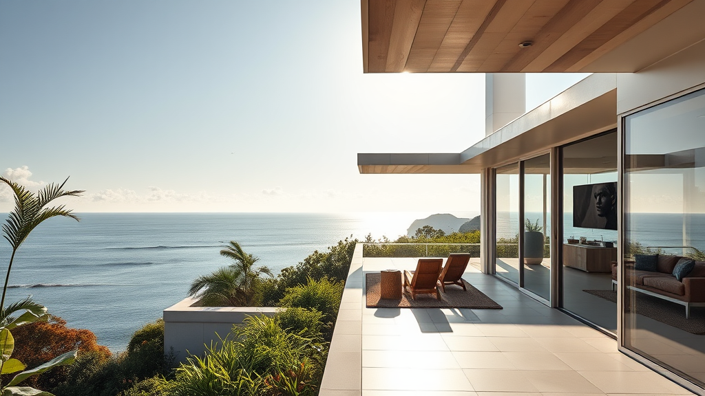 Hyper realistic exterior photo at eye level of a mid century modern style house with sweeping views of the ocean, bathed in natural daylight, showcasing soft, diffused lighting reminiscent of a picturesque AD magazine cover, influenced by the architectural geniuses of Frank Lloyd Wright, Charles and Ray Eames, and Mies van der Rohe, featuring sleek lines, extensive glass walls, and an inviting open terrace perfect for embracing the coastal breeze, set against a backdrop of lush greenery adding a touch of serenity.