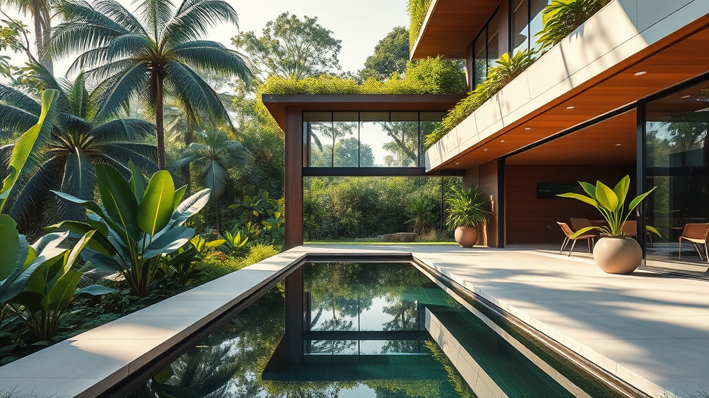 Hyper realistic exterior photo capturing a futuristic style house at eye level, overlooking a lush jungle. The scene is bathed in natural daylight with soft, indirect lighting, reminiscent of features from AD magazine. The architectural design echoes the innovative spirit of Frank Lloyd Wright, with sleek lines and elegant simplicity inspired by Eames and Mies van der Rohe. The house incorporates sustainable materials and boasts large glass panels that blur the boundary between inside and out, with verdant plants integrated into the structure. Small creative flourishes include a rooftop garden and a serene reflection pool that mirrors the surrounding greenery.