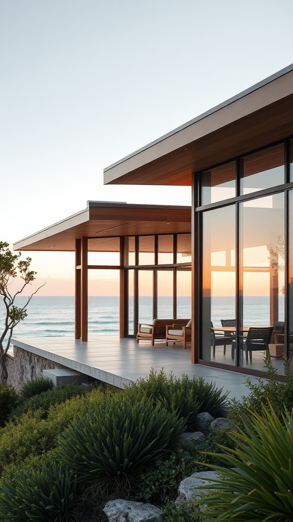 Hyper realistic exterior photo of a mid-century modern style house with large glass windows overlooking the ocean; full daylight with soft, indirect lighting; reminiscent of an AD magazine feature; inspired by Frank Lloyd Wright, with subtle touches of Charles and Ray Eames' design aesthetic and Mies van der Rohe's minimalist philosophy; features a flat roof, natural wood accents, and a seamless blend with the surrounding landscape, with a touch of lush greenery for a harmonious and tranquil ambiance.