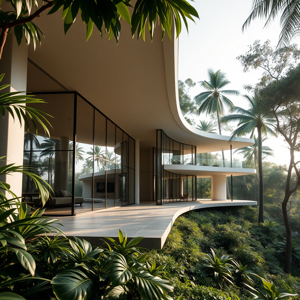 Hyper realistic eye level exterior photo of a futuristic style house nestled on the edge of a lush jungle, bathed in soft daylight with indirect lighting, capturing an essence suitable for an architectural feature in AD magazine. The design melds elements of Frank Lloyd Wright's organic architecture, the sleek functionality of the Eames' work, and Mies van der Rohe's minimalist elegance. The house boasts expansive glass walls that seamlessly integrate with the surrounding wilderness, while geometric overhangs provide shade and aesthetic balance. Sustainable materials and innovative technology are harmoniously incorporated, creating an oasis that feels both modern and timeless in its verdant, tropical setting.