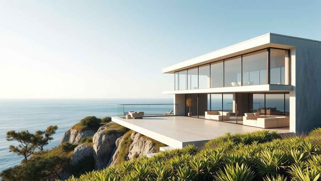 Hyper realistic eye level exterior photo of a mid century modern style house with expansive glass walls and minimalist design, set on a cliff with a breathtaking ocean view, clear daylight sky, soft indirect lighting, reminiscent of AD magazine aesthetic, influenced by Frank Lloyd Wright's integration with nature, Eames' elegant simplicity, and Mies van der Rohe's structural clarity, hints of lush greenery surrounding the scene, adding vibrant contrast to the sleek architecture.