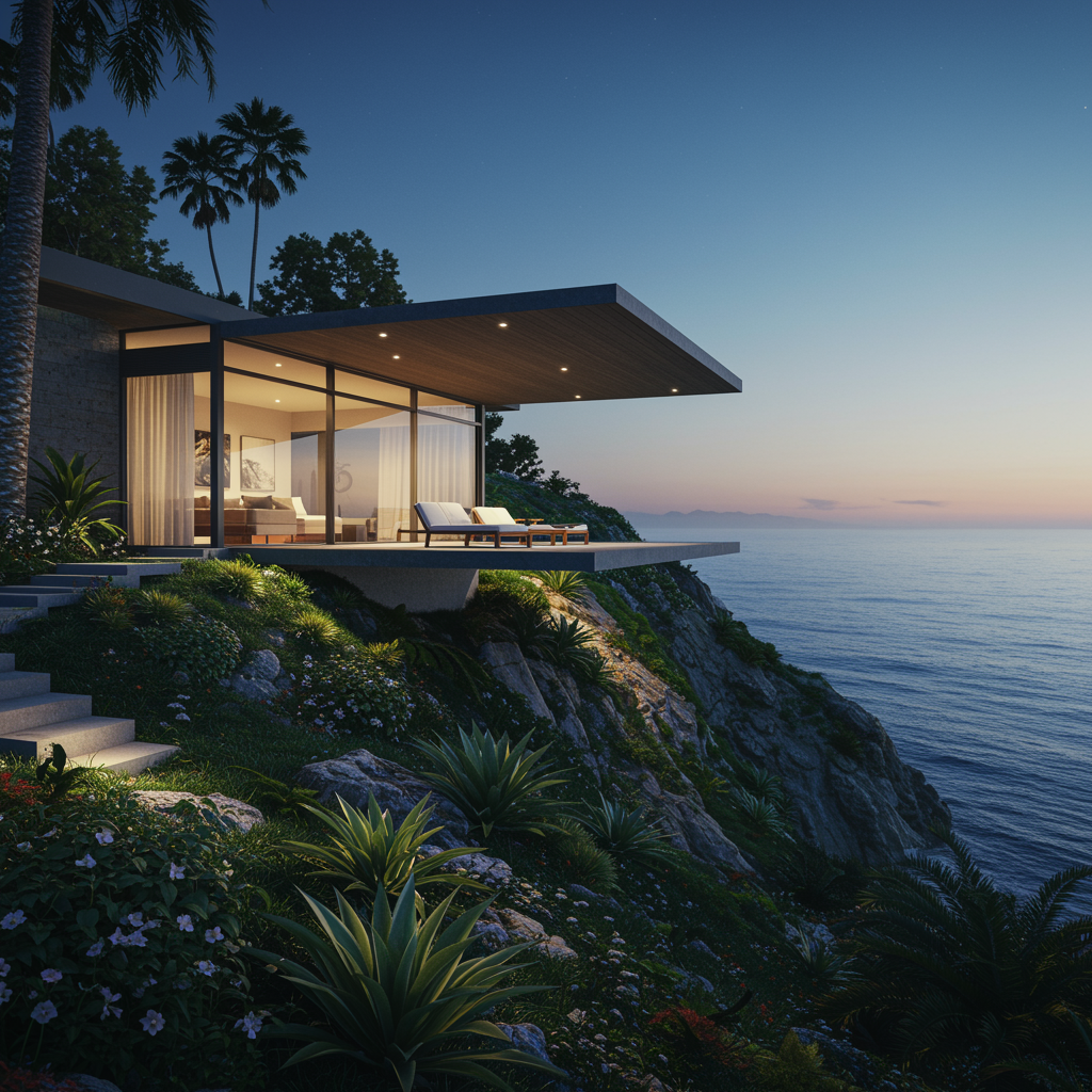 Hyper realistic eye level exterior photo of a mid century modern house perched on a cliff with panoramic ocean views, daylight, soft indirect lighting, reminiscent of designs featured in AD magazine, blending the organic harmony of Frank Lloyd Wright, the sleek simplicity of Eames, and the structural innovation of Mies van der Rohe, featuring floor-to-ceiling glass windows, a cantilevered deck, and lush greenery integrated into the architecture.