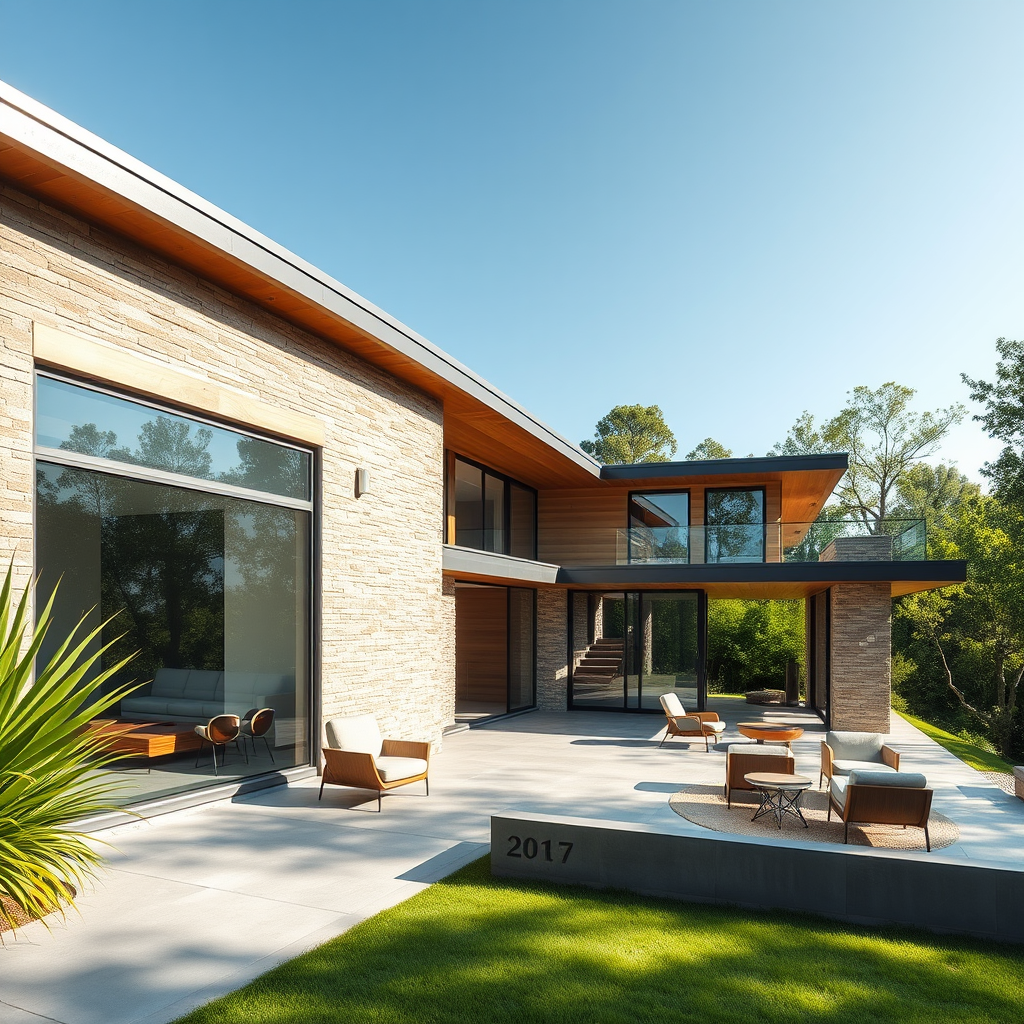 Hyper realistic eye level exterior photo of a stunning mid-century house showcasing seamless integration of natural stone and wood materials into the lush surrounding landscape during daylight, echoing the sophisticated style of Charles and Ray Eames, with large glass windows reflecting the vibrant greenery and an inviting terrace adorned with modern minimalist furniture, perfect for a feature in AD magazine.