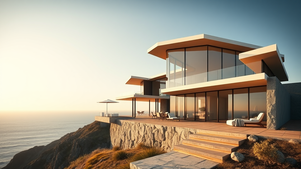 Hyper realistic eye level exterior photo of a stunning mid century modern style house with expansive glass windows and clean lines, perched on a cliff with a breathtaking ocean view under the soft daylight. The indirect lighting gently illuminates the minimalist landscape surrounding the home. The architecture echoes influences from Frank Lloyd Wright, Charles and Ray Eames, and Ludwig Mies van der Rohe, featuring a harmonious blend of natural materials like stone and wood. A unique cantilevered roof adds a dynamic touch, while the open terrace invites a seamless indoor-outdoor living experience, capturing the essence of an AD magazine spread.