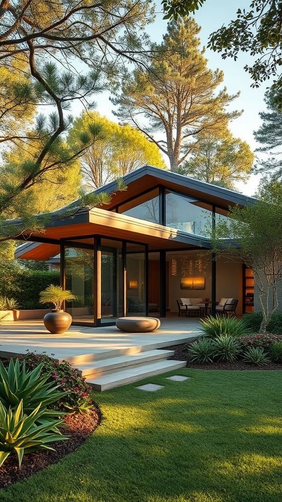 Hyper realistic eye level exterior photo of a stunning mid-century house featuring an elegant blend of natural materials harmoniously integrated into the lush surrounding landscape, captured in the warm glow of daylight, inspired by AD magazine aesthetics, reminiscent of the iconic designs by Charles and Ray Eames, with a touch of modern minimalist furnishings and expansive glass panels inviting the outside in.