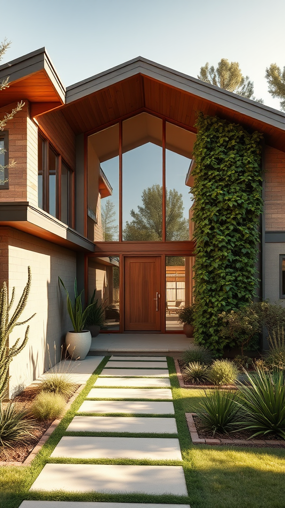 Hyper realistic eye level exterior photo of a stunning mid-century home, featuring natural materials that harmonize with the surrounding landscape bathed in daylight, resembling a spread in AD magazine, inspired by the iconic designs of Charles and Ray Eames, with a touch of modern glass elements and a lush vertical garden.